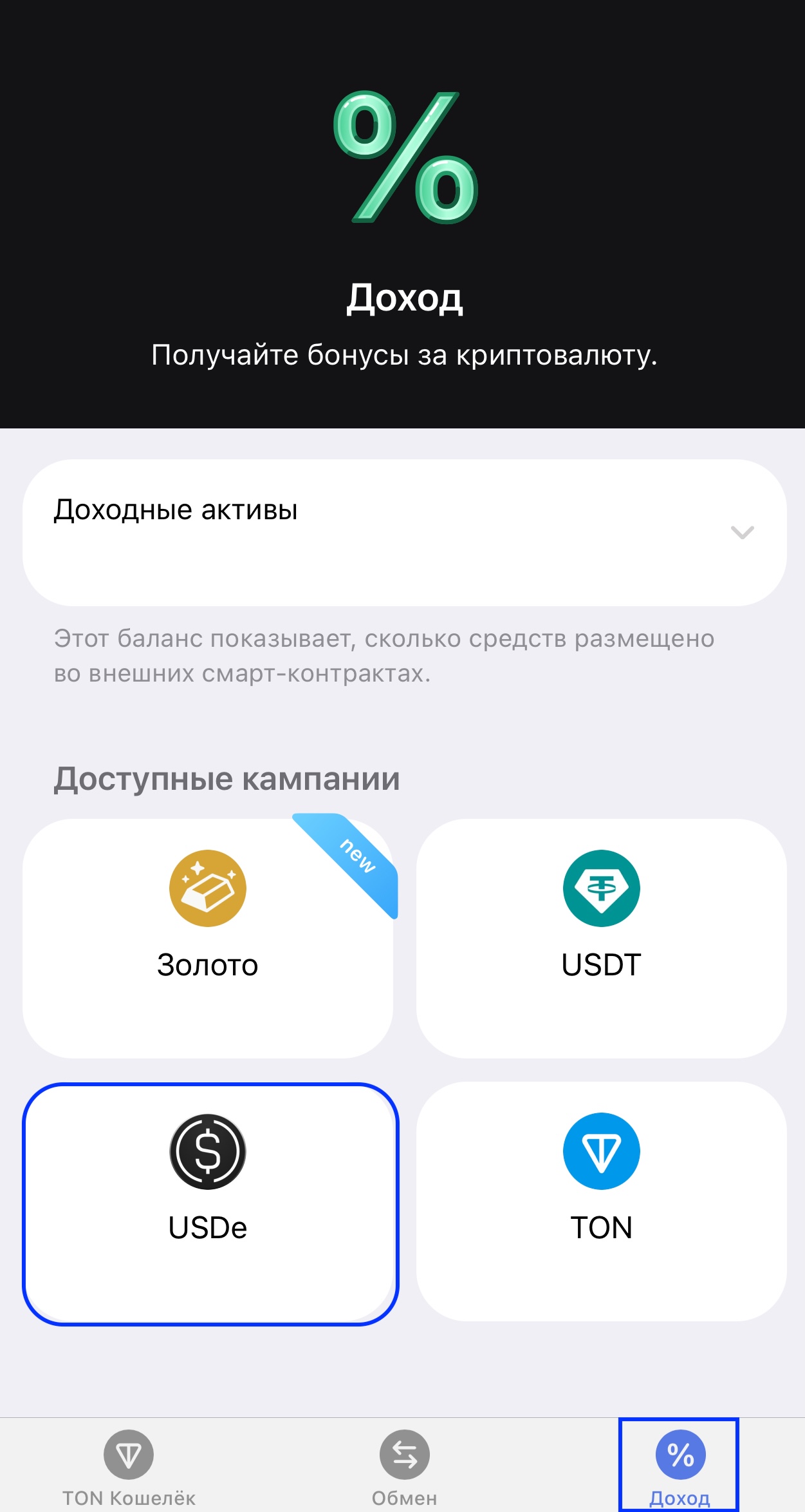 - Откройте свой TON Кошелёк и нажмите на кнопку “Доход” в главном меню. После этого на следующей странице выберите USDe.