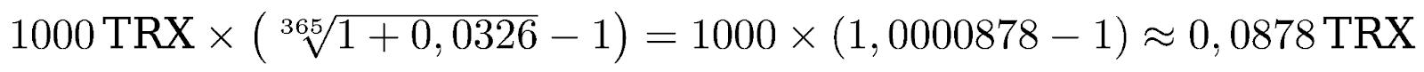 Разберём пример выше с учётом ставки 3,26%. Бонус 7 марта будет рассчитан из суммы 0 TRX, так как минимальный остаток на 6 марта составлял 0 TRX. Бонус 8 марта будет рассчитан из минимального остатка за 7 марта — 1000 TRX, и будет составлять примерно 0,0878 TRX.