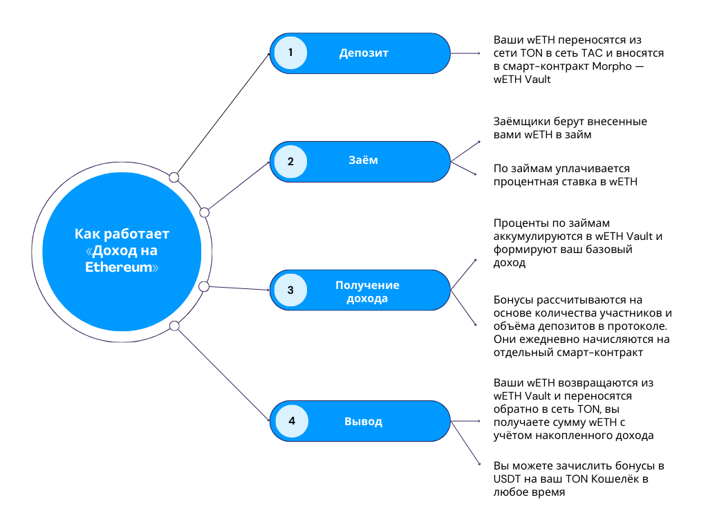 «Доход на Ethereum» — это DeFi-протокол от сервиса Morpho, который доступен прямо в TON Кошельке. Он даёт возможность: