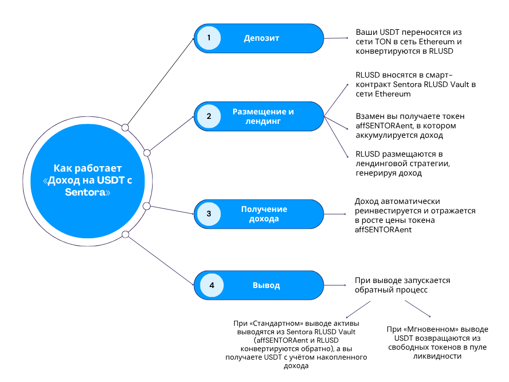 В интерфейсе TON Кошелька вы видите только внесение и вывод USDT — все операции внутри Sentora RLUSD Vault выполняются автоматически.